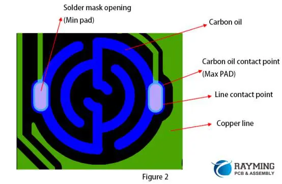- Insulating oil: The carbon contact should be shaved at least 0.10mm from one side of the line pad. Same as all the solder mask opening. Protective oil: It is not necessary to shave solder mask opening on the carbon contact; cover the carbon bridge, and shave others. The buttons area must also be shaved, and the distance from the buttons is more than 0.30mm.